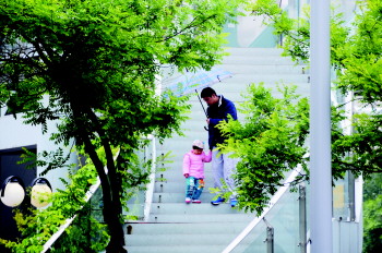周末两天,德州市区一直在下雨。5月10日,湖滨大道过街天桥上,一位家长一手举着伞一手呵护着下楼梯的孩子。 本报记者 马志勇 摄