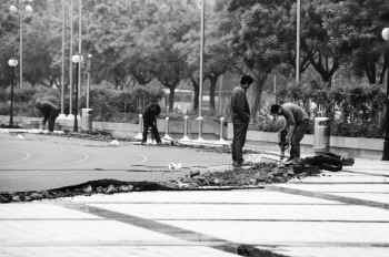 5月10日,中心广场上,施工工人趁着雨天活动的市民较少,抓紧对跑道边缘整修。