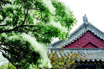 “仙山古刹华严寺,万木吐绿花绽放。”近日,崂山风景区华严寺内的流苏和绣球花儿竞相绽放,吸引了大批游客前来观赏。位于华严寺三圣殿后的流苏是崂山风景区最大的一棵流苏古树,这棵古树已经有200多年树龄,每年春末夏初,白花满枝,如覆霜盖雪。