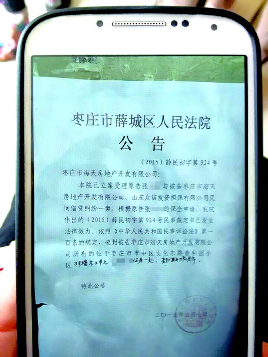 王女士说,查封公告张贴没多久,就被人撕掉了。根据一位业主提供的照片,记者看到,查封公告称,薛城区人民法院已立案受理原告张玉某与被告枣庄市海天房地产开发有限公司、山东众信投资担保有限公司民间借贷纠纷一案,根据原告张玉某的保全申请,查封枣庄市海天房地产开发有限公司所有的位于枣庄市中区文化东路泰和园小区#号楼#单元#住房一处,查封期限叁年。