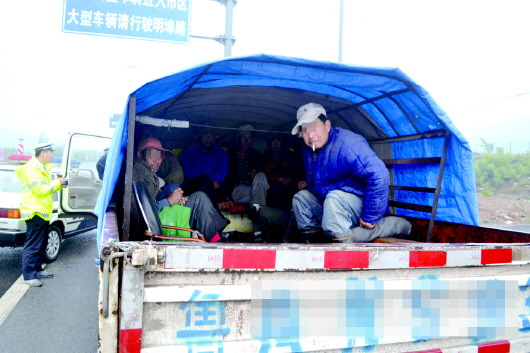 5月7日5时30分,交警大队文祖中队民警在省道242线巡逻时,一辆遮盖篷布的小货车由南向北行驶,引起值勤民警注意。当民警示意该车停车接受检查时,发现车厢内竟坐了满满一车人。