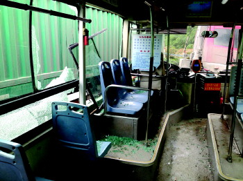 ▲公交车左侧受损严重。 本报记者 孟杰 摄