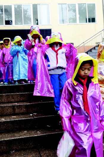 ◥学校给孩子们配发的雨衣。 李珍梅 摄