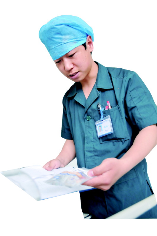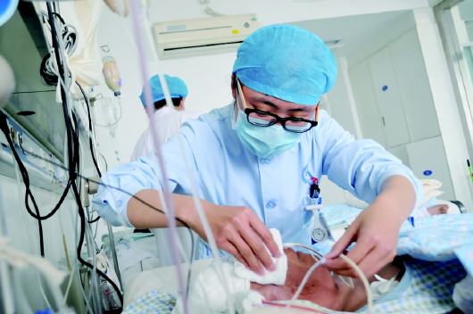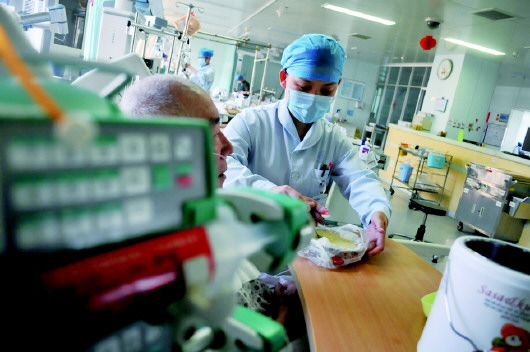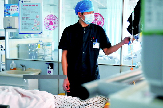 重症监护室的护士秦萌萌正在帮助一位病人进食。