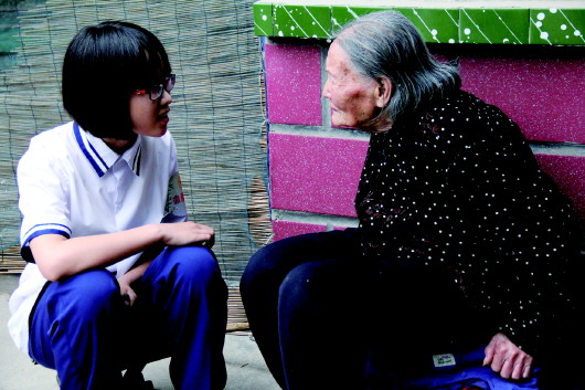 “微爱”少年代表与张同和91岁聊家常。 本报记者 王泽云 摄