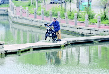 东昌湖边一位市民在用湖水洗摩托车。 (市民邹女士提供)