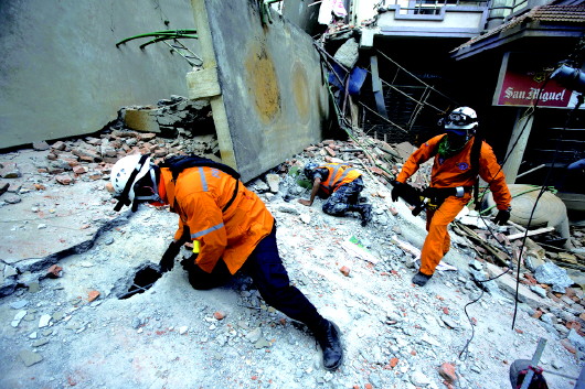 12日,在尼泊尔加德满都,救援人员在被地震损毁的建筑物废墟上查看。 新华/路透