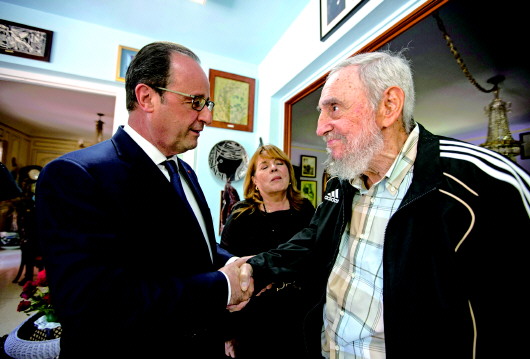 5月11日,古巴前领导人菲德尔·卡斯特罗(右)会见到访的法国总统奥朗德(左)。 新华/美联