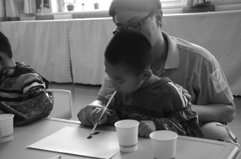 12日下午2点半,志愿者们准时来到了济宁市妇幼保健院孤独症儿童康复中心,孩子们用掌声对这些哥哥、姐姐们的到来表示欢迎。7岁的恒恒尽管不大爱说话,但十分喜欢画画,橙丝带志愿者团队的志愿者别出心裁,手把手教恒恒画起了“吹墨画”。