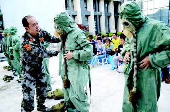 12日,在中国石油大学(华东),黄岛区人防办工作人员正在教大学生们学习穿戴防化服,并进行了防空地下室疏散演练。当天是第七个国家防灾减灾日,黄岛区专门开展了以“科学减灾,依法应对”为主题的宣传教育活动。 本报记者 潘旭业 本报通讯员 刘晓华 摄影报道