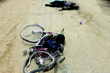 大货车转弯时刮倒自行车致使受害者死亡。 华祥 摄