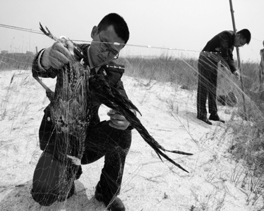 4月30日,“保护野生鸟类,边防民警在行动”为主题的爱鸟护鸟月活动在滨州贝壳堤岛与湿地国家级自然保护区启动以来,边防大队民警组成10支义务宣传小分队,分头向游客介绍爱鸟护鸟知识。图为边防民警正在自然保护区内的一片湿地里拆除捕鸟网具,放生捕获的野鸭和雉鸡。