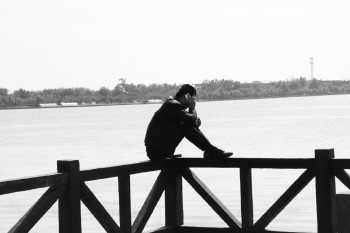 有人坐在龙堤(原南关岛)西侧木栈道的栏杆上打电话。(市民华夏提供)