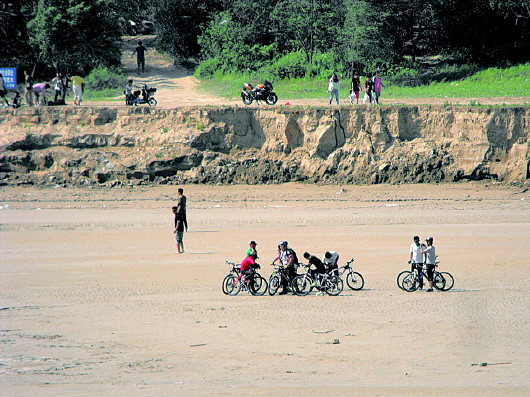 ◥黄河岸边有很多泥沙,不仅淤积河道,也给游人带来安全隐患。