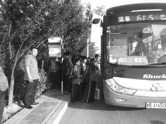 13日,乘客排队乘坐“守时公交”。本报记者 官文涛 摄