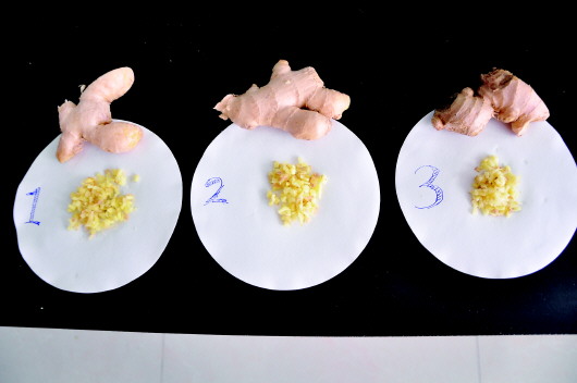 从表面上看,欧女士买的姜湿润光滑,颜色发黄,外观很好看,记者将其编为1号;记者从农贸市场买的姜,颜色发白,比较干燥,品相也比较好,编为2号;记者从超市买的一份姜,颜色呈浅褐色,也比较干燥,品相稍差一些,编为3号。
