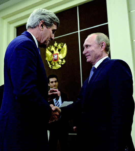 12日,在俄罗斯索契,美国国务卿克里(左)与俄罗斯总统普京在会谈前握手。 新华/俄新