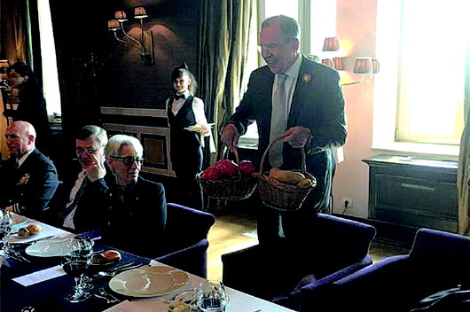12日,俄罗斯外长拉夫罗夫手提一篮土豆和一篮西红柿,将其作为礼物送给美国国务卿克里。