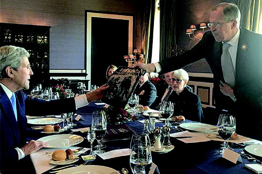 12日,俄罗斯外长拉夫罗夫将一件印有“胜利”字样、纪念卫国战争胜利70周年的T恤衫送给美国国务卿克里。