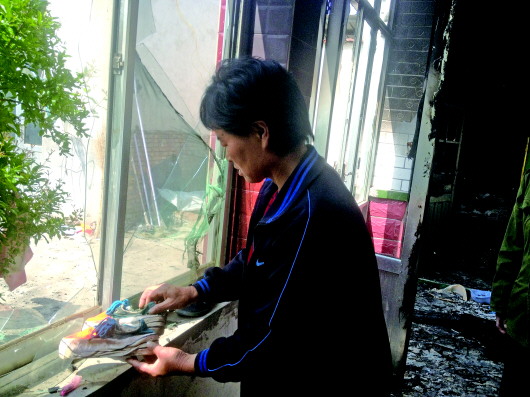 8日上午,在柳家村潘女士家里,记者看到院子里一片狼藉,门洞里堆积着几床烧焦的被褥,倒塌的房梁横七竖八躺在院子里。五间砖瓦房的房顶已经烧成灰烬,大火侵蚀后的正房里漆黑一片,木门早已烧毁,门窗上烧碎的玻璃散落了一地。