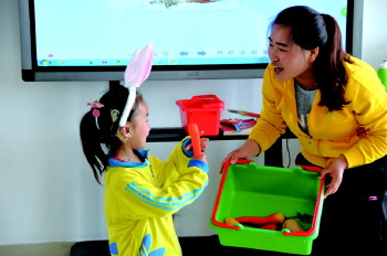 在另一间大教室里,10多个孩子围成半圆,有的扮成小白兔拿出胡萝卜,并大声回答所拿的东西,通过角色扮演游戏,提高孩子的听觉和认知能力。