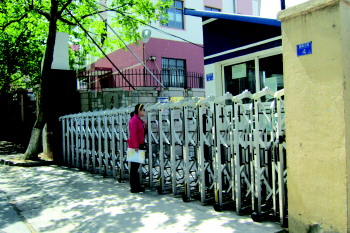 13日民办学校报名首日,学校门口静悄悄。一名已经提前登记的家长在咨询。 李珍梅 摄