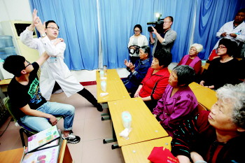 13日,在永清路街道社区卫生服务中心,社区医生正在手把手教社区居民如何有效预防、治疗肩周炎。近日,该中心在岛城首推“家庭保健员计划”,从辖区中推选自身有慢性病或家庭成员有慢性病的居民当选家庭保健员,每周举办一次家庭保健知识培训。该中心计划利用三年时间为1000户居民培训。 本报记者 张晓鹏 摄影报道