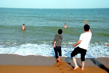 13日,日照最高温达到29℃,明晃晃的阳光照射在万平口的沙滩上,吸引了不少赶海的游客。靓女们挽起裤腿,光着脚丫漫步在海水边,任海风吹着她们的长发,感受着初夏的到来。几个小伙子,穿着泳裤,赤着上身,扎入海中,零距离接触大海的魅力。
