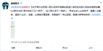 根据微博上的一条消息,11日,“周村被偷了三个小孩”,该消息称一陌生人刚把孩子迷晕,就被老师及时发现,偷孩子的两人已被警方带走。“他们交代,这次他们团伙派了100多人,专偷7岁以上的孩子,要人体器官。”该信息还提醒各位家长在微信圈转发,留意保护自己家的孩子。