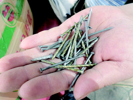 15日早上林先生在八一立交桥下辅道上捡到的钉子。 见习记者 高寒 摄
