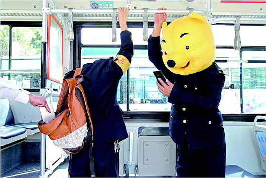 公交二分公司驾驶员戴上卡通头套,模仿低头族被偷。 本报记者 孟燕 摄