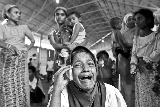 16日,在印尼兰沙,一名幸运上岸的罗兴亚偷渡者与在马来西亚的亲属通话时痛哭。新华/路透