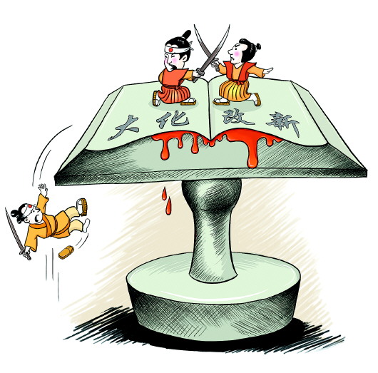 公元645年,中大兄皇子发动“乙巳政变”将重臣苏我入鹿拉下马,并推出了“大化改新”。 漫画/徐进