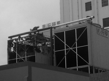 21日下午3点,记者来到火灾现场时,火势已被控制。记者看到,着火的是开发区管委空调机房顶部的冷却塔。冷却塔北侧过火较为严重,仅剩下一个黑黑的铁架子,南侧稍轻一些。庆幸的是,空调机房内部没有受到火灾的影响。