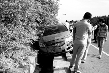 21日下午,在两城街道两城路与潮石路交汇处,一辆大货车与一辆小轿车发生碰撞,小轿车左前侧破损,并倾斜至路边的排水沟。