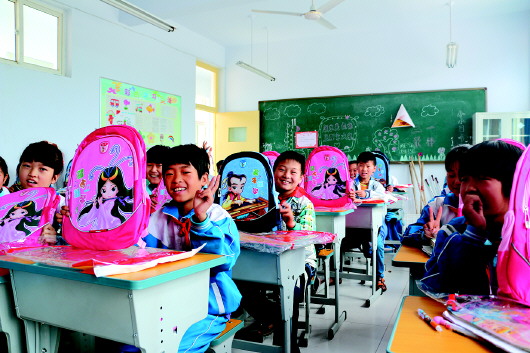 甜水井希望小学的孩子们领到崭新的孔子书包。