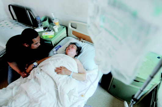 大图:22日,菏泽农妇李巧粉的丈夫李国峰在照顾手术后的岳母高玉环。李巧粉患尿毒症,61岁的母亲捐肾救女。