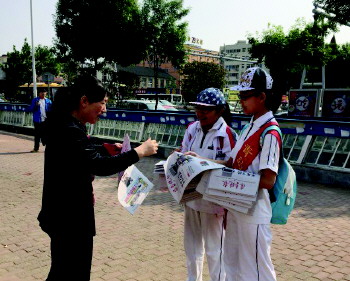 超银中学的同学们在义卖报纸。 陈之焕 摄