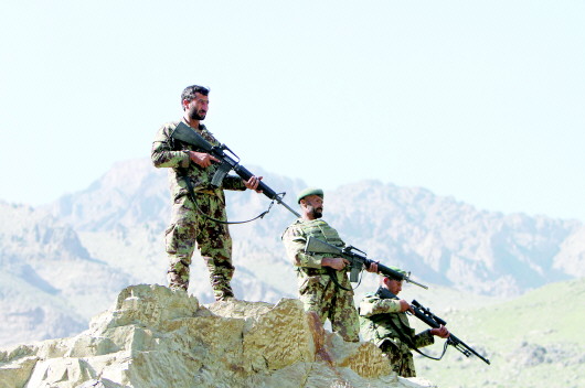 2015年4月13日,阿富汗喀布尔,数名阿富汗士兵正在路旁站岗。随着驻阿美军的逐步撤出,阿富汗局势出现再度恶化的征兆。