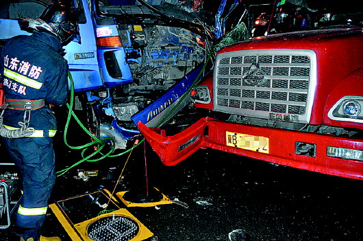 本报96706热线消息(记者 张泰来) “咣”,凌晨突然传出一声巨响,两辆重型货车在立交桥下相撞,一车驾驶室变形两人被困其中。这是11日发生在经十路的一幕,幸运的是,被困的两人经消防救援送到了医院均没有生命危险,可车祸也造成了至少10万元的经济损失。而引发事故的,是其中一辆大货车闯红灯。