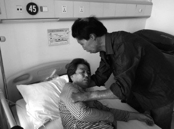 王亦春在医院守护在妻子身旁。本报记者 赵松刚 摄