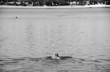 近日,气温不断升高,25日,一市民绑着浮漂物在新湖游泳。 本报记者 马志勇 摄
