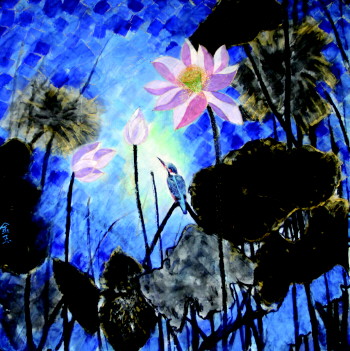 家门前的荷塘伴他成长,小桥流水、荷塘柳荫、湖畔渔舟都赋予了他艺术素养,荷花自然成为他艺术生命之爱,赏荷、画荷,情注笔墨,耕耘不辍。他的荷花系列画作深得恩师石齐先生好评,特别是对他画中蓝色语言的独到表现,称其有真情,有新意,赠书“河深莲润”,褒赏有加,更使他笃勤精进,不断收获,令人惊羡。