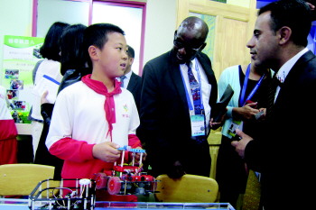 25日,在青岛市实验小学创客体验中心,“小创客”向外国嘉宾介绍灭火机器人。 李珍梅 摄
