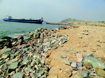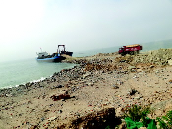 25日上午8点,记者来到位于崂山路南侧的石老人高尔夫俱乐部东部,短短20多分钟内,就先后看到不下十辆大货车满载土石,顺着高尔夫俱乐部与金光·丽海新园小区间新修的一条水泥路驶向海边,多数土石卸到停在岸边的一大型施工船上,也有部分直接沿着海岸线倒进了海里。