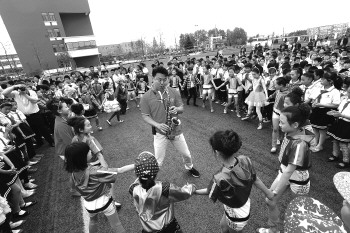 5月23日,在山海天旅游度假区安哲小学,文艺志愿者在为小学生表演节目。当日,是第二个中国文艺志愿者服务日,日照市文联开展“到人民中去”文艺志愿服务主题活动,组织文艺志愿者深入社区、农村、军营、学校和企业,把高品质的文艺志愿服务送到基层。