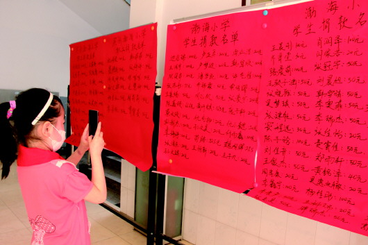 25日,本报刊发了《不幸姐妹花 先后染重病》一文,报道了沾化区泊头镇贾家村的李晓悦、李晓倩两姐妹被先后查出患有系统性红斑狼疮一事。当天,妹妹李晓倩所在的学校渤海小学自发组织捐款,一下午的时间共捐款12017元。另外,25日还收到社会爱心人士的捐款23400元。姐姐李晓悦所在的沾化二中目前也正在为她募捐,沾化一中的师生们知道后也开始为她们募捐,具体善款还未统计。图为李晓倩把学校里的捐款情况用手机拍下来,好记住大家的爱心。 本报记者 王晓霜 摄