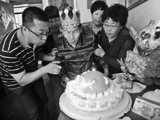 23日,长征居委会工作人员买来鲜花,社区在职党员冯志强和妻子带着蛋糕到老人夏秀英家中为她庆祝100岁生日。