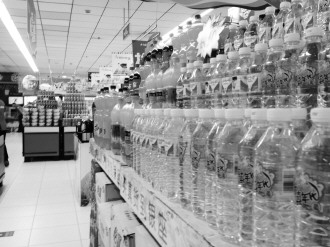 25日记者走访了枣庄市市中区的银座超市、贵诚超市、杨宁超市等几家大型超市,发现各家超市内摆在货架主要位置以及促销展台上的基本都是各品牌的纯净水,原来常见的五花八门的各种“花样水”虽然还有货,但是品种和存货量已经很少。而且相当一部分都用红字印上了打折价,进行促销。记者在一超市中找到一瓶正在打折的某品牌“冰川水”,看生产日期还是2013年产的,虽然还在保质期时间内,但足见这种水的出货量已经非常有限。