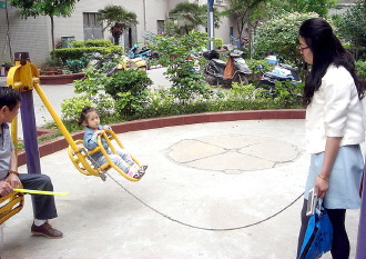 时间:2015年5月17日 自述:小姑娘坐在“秋千”里面,妈妈通过手中的绳子拉着秋千荡来荡去,可真会享受啊! 点评:一根绳子让健身器材变成了娱乐器材,只不过妈妈要辛苦一点啦。